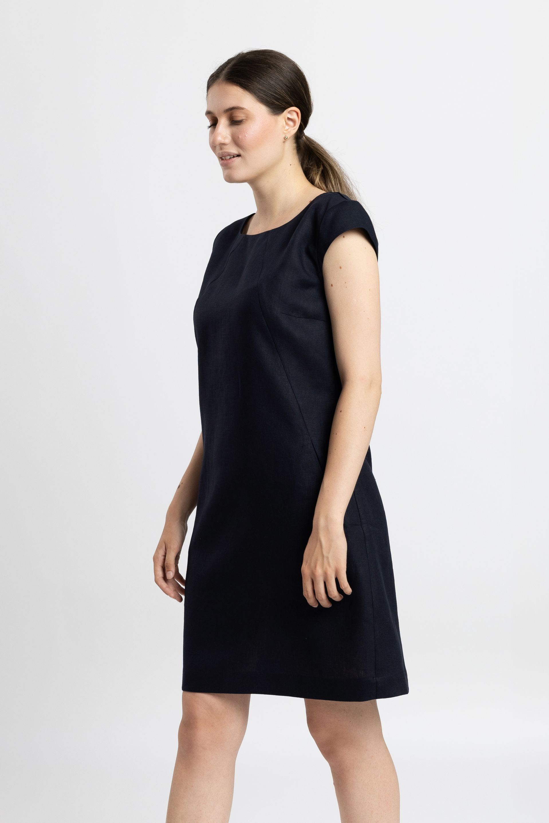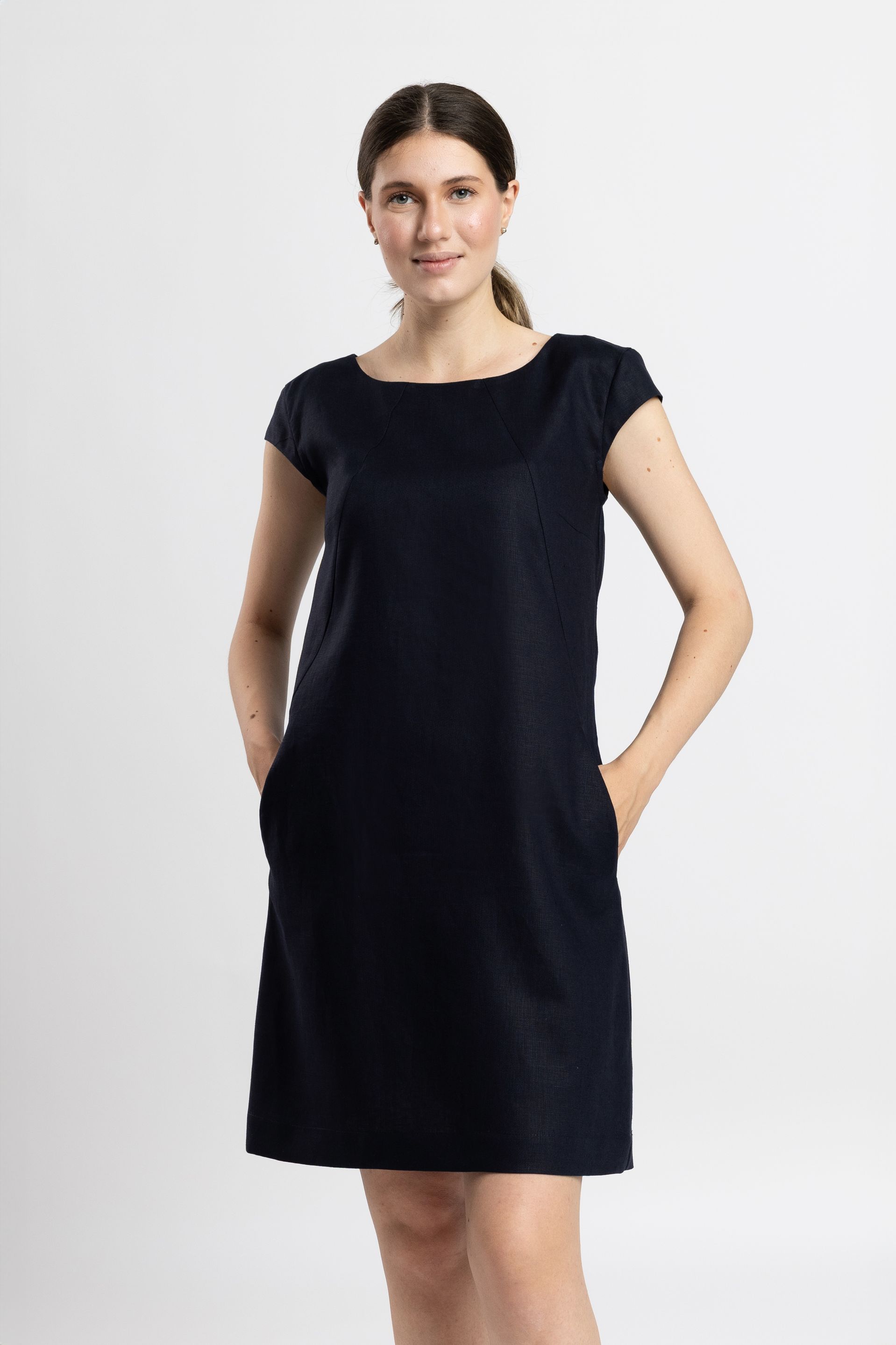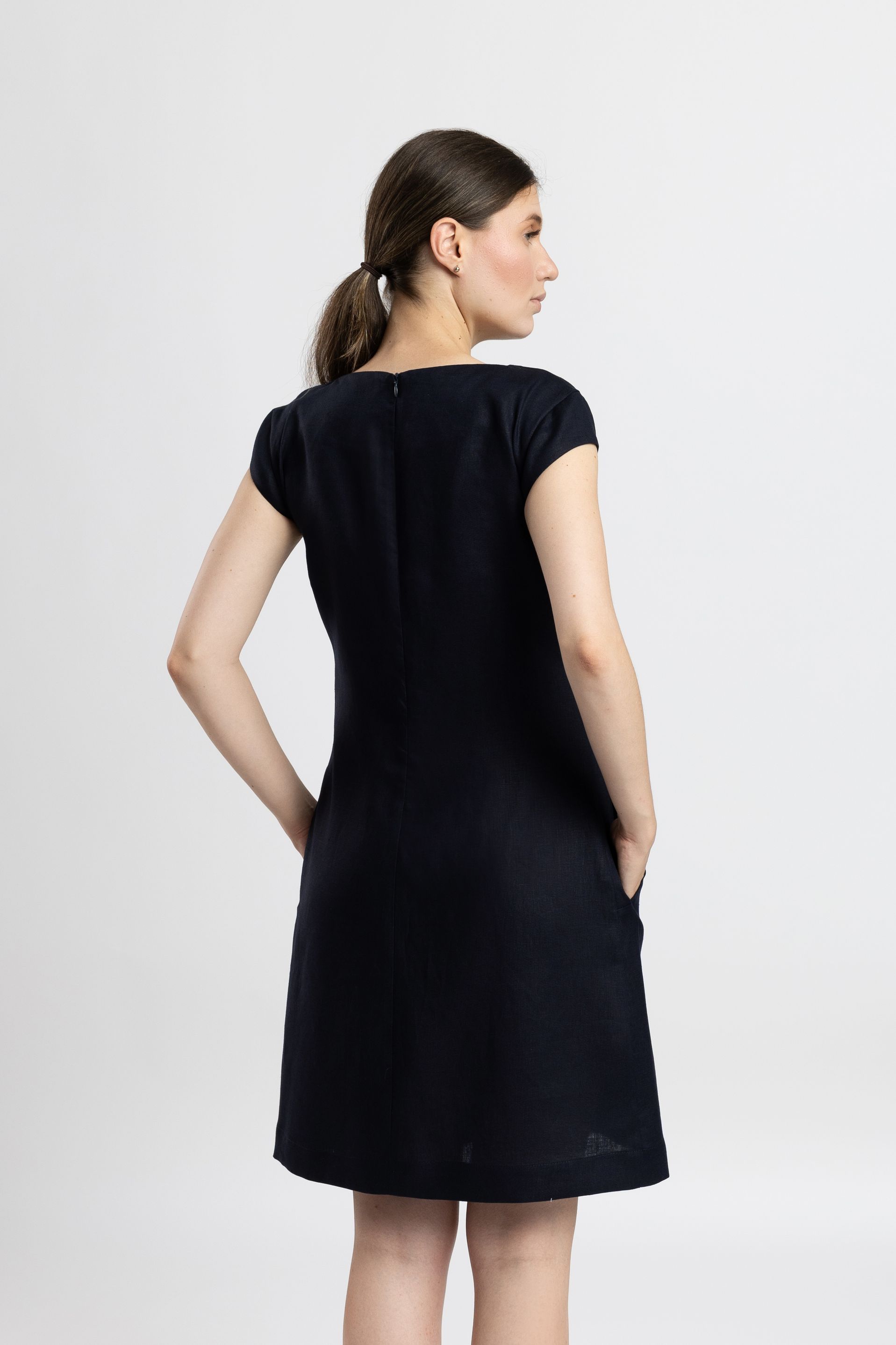 Robe courte en lin 100%. Coupe en A, avec des panneaux obliques sur le devant et des poches cachées. Fermeture à glissière au milieu du dos. La longueur pour la taille 38 est de 93 cm.